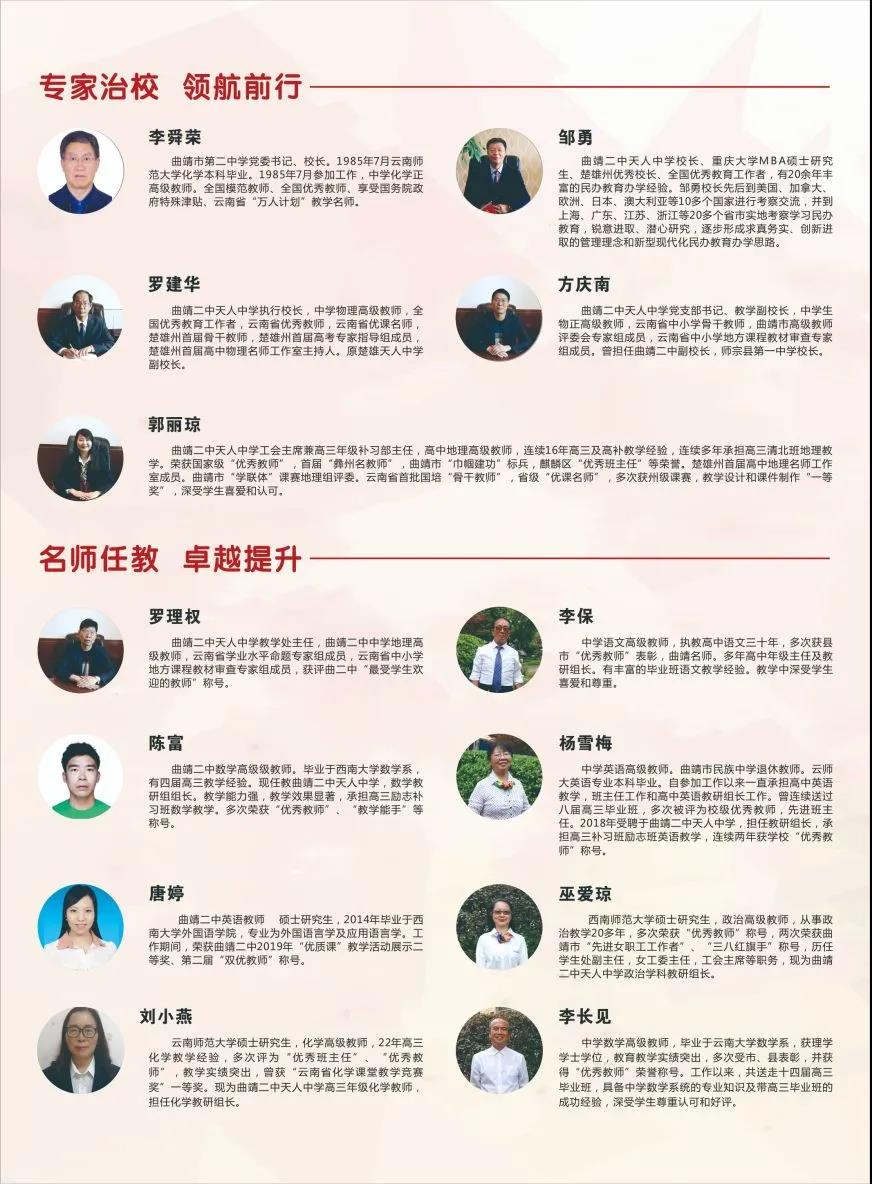 曲靖二中天人中學(xué)師資力量雄厚,擁有一支德教雙馨、樂于奉獻(xiàn)的教師隊(duì)伍。學(xué)校師資由五部分構(gòu)成:一:曲靖市第二中學(xué)委派的有豐富教學(xué)經(jīng)驗(yàn)的骨干教師和學(xué)科帶頭人;二:楚雄天人中學(xué)委派的有豐富教學(xué)經(jīng)驗(yàn) 的骨干教師和學(xué)科帶頭人;三:面向省內(nèi)招聘的優(yōu)秀公辦學(xué)校在職教師;四:曲靖一中、曲靖二中、曲靖民族 中學(xué)等名校退休返聘教師;五:面向全國招聘的教育部直屬六所師范大學(xué)為主的重點(diǎn)師范大學(xué)優(yōu)秀畢業(yè)生,且有5-8年執(zhí)教經(jīng)驗(yàn)。學(xué)校以曲靖二中為依托,全力打造一支高學(xué)歷、高素質(zhì)、高水平、有愛心、懂奉獻(xiàn)的教師隊(duì)伍,為每個(gè)孩子的健 康成長(zhǎng)保駕護(hù)航。